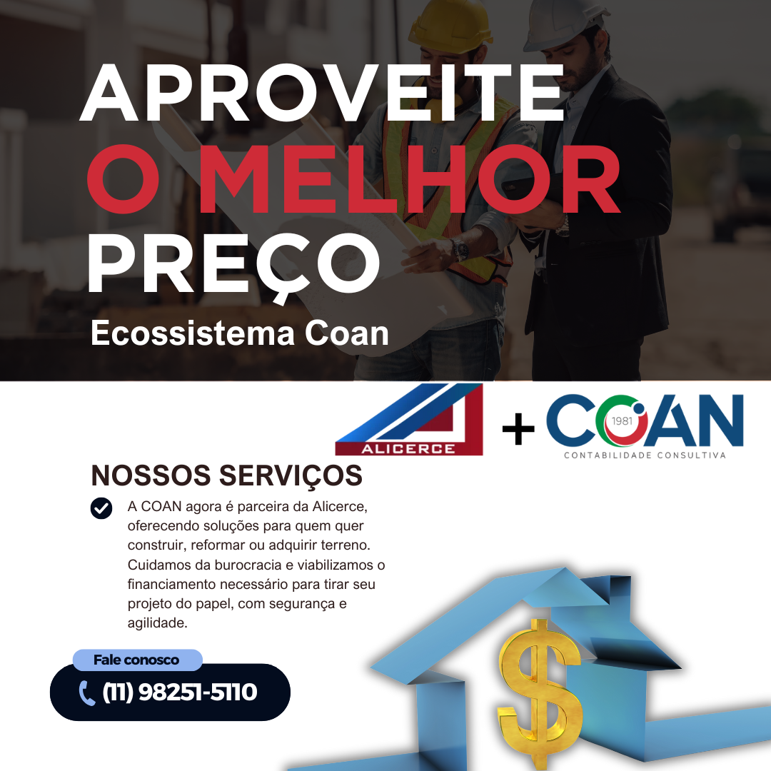 Agora, sendo cliente da COAN Contabilidade, você tem acesso exclusivo à parceria com a Alicerce, especialista em soluções para quem deseja construir, reformar ou adquirir terrenos.